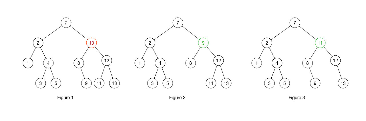 node들을 제거하는 것은 쉽다. node를 지우고 나서, 해당 위치에는 좌측 child 값 보다 크고 우측 child 값 보다 작은 값으로 대체되어야 한다. 그래서 node를 제거한 이후에도 트리는 정렬되어 있게 되는 것이다. 아래 예시를 보면 10은 제거되었지만 9나 11로 대체된 것을 볼 수 있다.