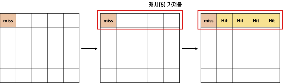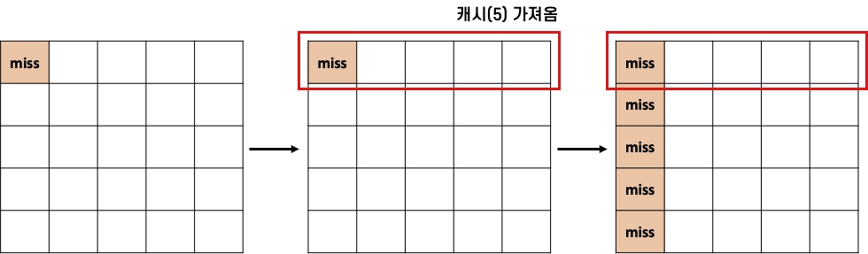 처음에만 캐시 미스가 발생하고, 그 다음부터는 공간적 지역성 덕분에 캐시 히트의 장점을 누릴 수 있다. 행이 바뀔 때만 캐시 미스가 발생하게 되며 나머지 경우는 모두 캐시 히트하여 효율적으로 운영할 수 있다.