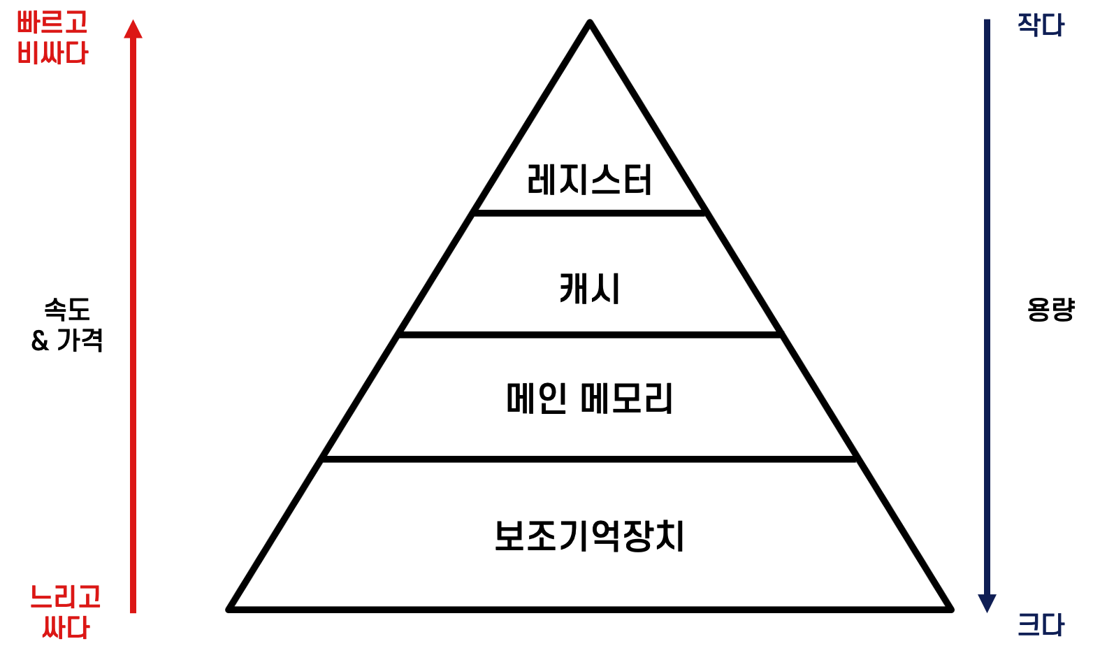메모리는 데이터를 저장하는 장치이다. 메모리는 컴퓨터 성능과 밀접한 관계를 가지기에 크고 빠르며 비용이 저렴한 메모리를 요구하게 된다. 하지만 앞서 말했던 것 처럼 속도가 빠른 메모리(레지스터 등)은 가격이 비싸고, 용량이 작다는 단점이 있고, 반대로 보조기억 장치와 같은 것들은 가격은 저렴하고, 용량도 크지만 속도가 느리다. 이런 정보들을 가지고 메모리 계층 구조를 구성하여 비용, 속도, 용량을 서로 상호호 보완한다.