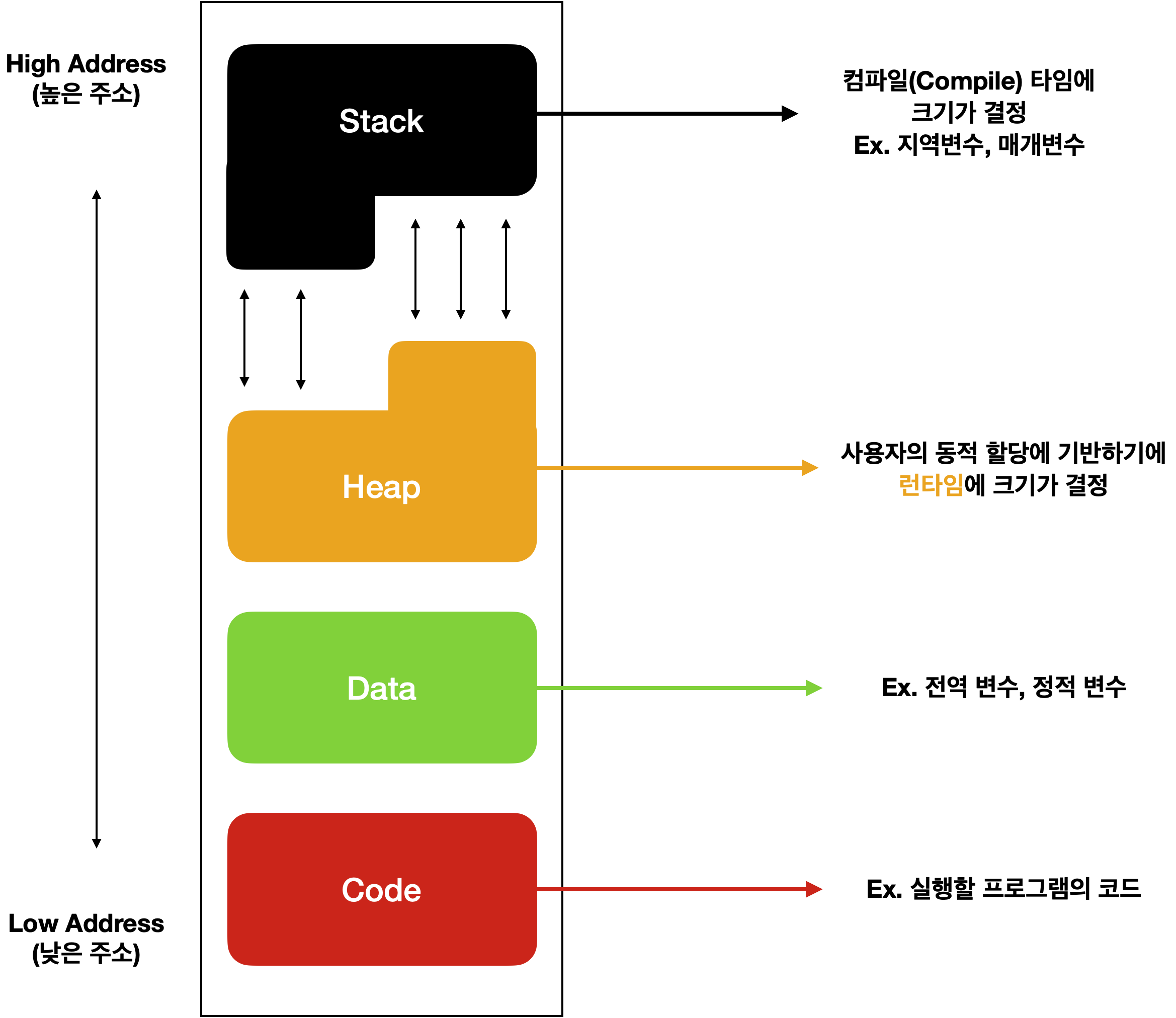 그리고 앞서 봤듯이 힙 영역이 낮은 메모리 주소에서 높은 메모리 주소 방향으로 메모리를 차지하였다면, 스택 영역은 높은 메모리 주소에서 낮은 메모리 주소 방향으로 메모리를 차지하게 된다. 그러면서 아까 봤던, 스택/힙 오버플로우가 발생하게 되는 것이다. 추가적으로 힙 영역과는 달리 스택 영역은 메모리 크기 제한이 있어서 이에 유념하여 사용해야 한다.