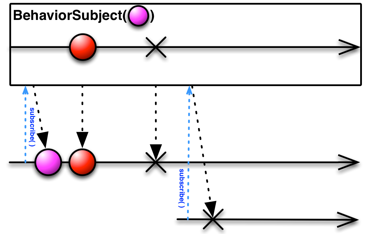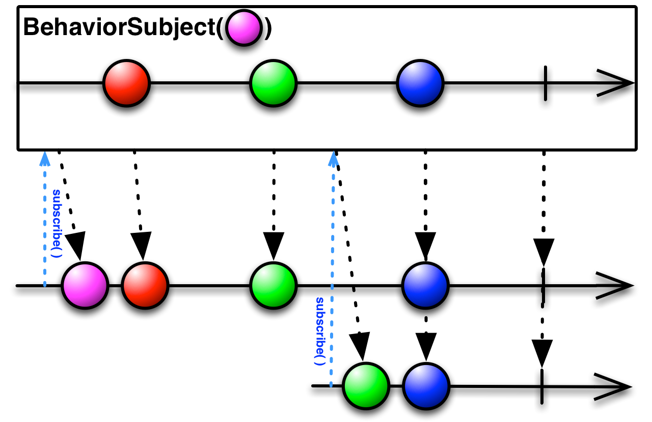 위 그림에서처럼 핑크색 공을 초기값으로 가지다가, 빨간색 공이 들어오니 빨간색 공을 아래 스트림으로 보내준 것을 볼 수 있다. 쭉 진행하다가. 초록색 공을 받을 상태에서, 다시 구독하게 되면 초록색을 초기값으로 여겨서 아래 스트림을로 보내주게 되는 것이다. 앞서 말한 것 처럼 최근 변경값을 저장하고 있는 것이다.