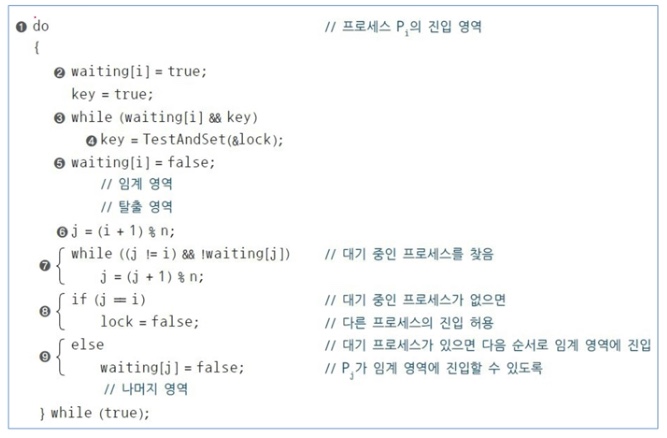 이 탐색은 (j+1) % n을 통해 수행된다. 이 때 j가 자기 자신(i)이거나, waiting[j]가 true이면 while문을 탈출할 수 있다.