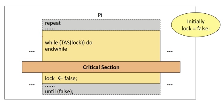 P0이 먼저 들어갔다고 하면 위 과정을 거치고 CS 영역에 들어가게 되며, 이 때 P1이 접근하려고 하면 lock이 true이기 때문에 while문 아안에서 돌게된다. P0이 작업을 마치고 lock을 false로 바꿔주면 그 때 P1이 while 문을 벗어나 CS 영역으로 진입할 수 있게 된다.