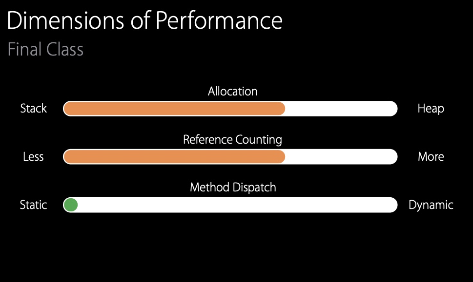 하지만 앞서 말한 것 처럼 final Class를 사용하면 상속이 불가하다는 것을 알려주기 때문에 강제적으로 static dispatch를 사용하여 이점을 얻을 수 있다.