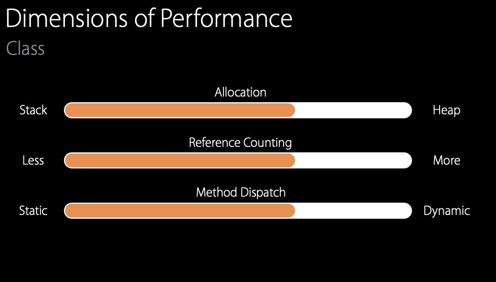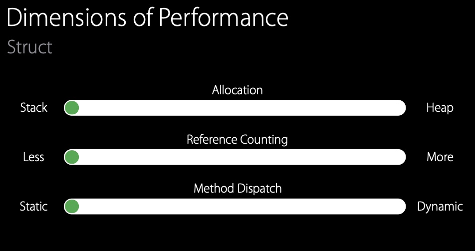 allocation, reference counting, method dispatch 어느 하나 빠질 것 없이 좋은 성능을 보인다. 이러니까 별 목적이 없다면 struct를 기본적으로 쓸 것을 애플이 권장하는 것 같다. 그러니까 우리도 타입을 선택할 때 이러한 성능들을 생각하고 선택하는 습관을 가져야 할 것 같다.